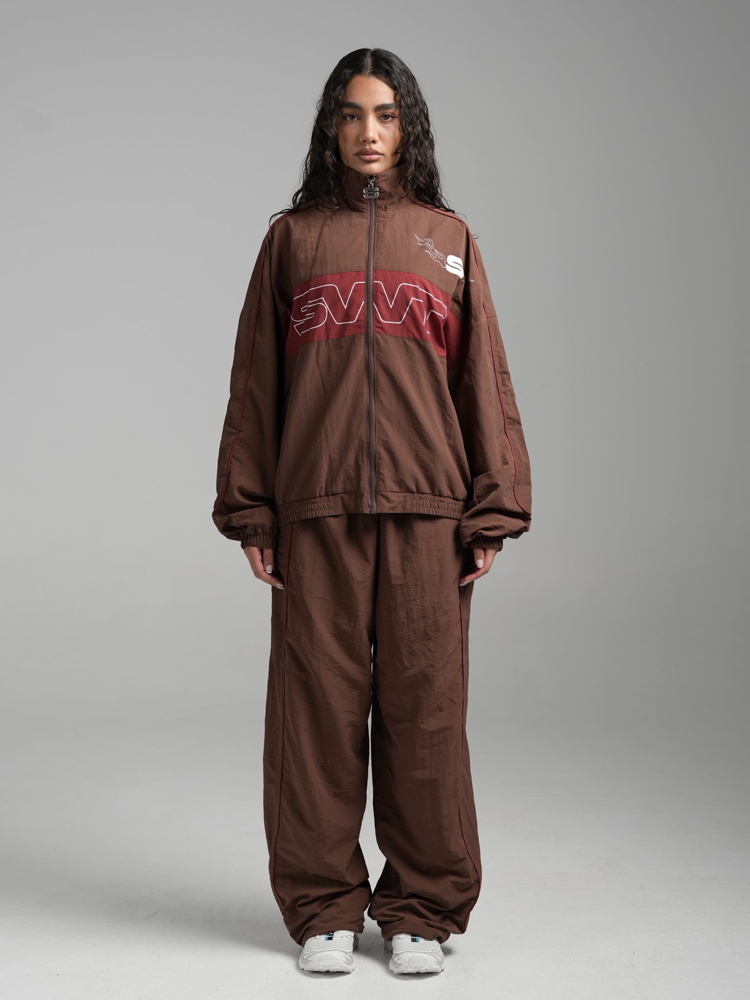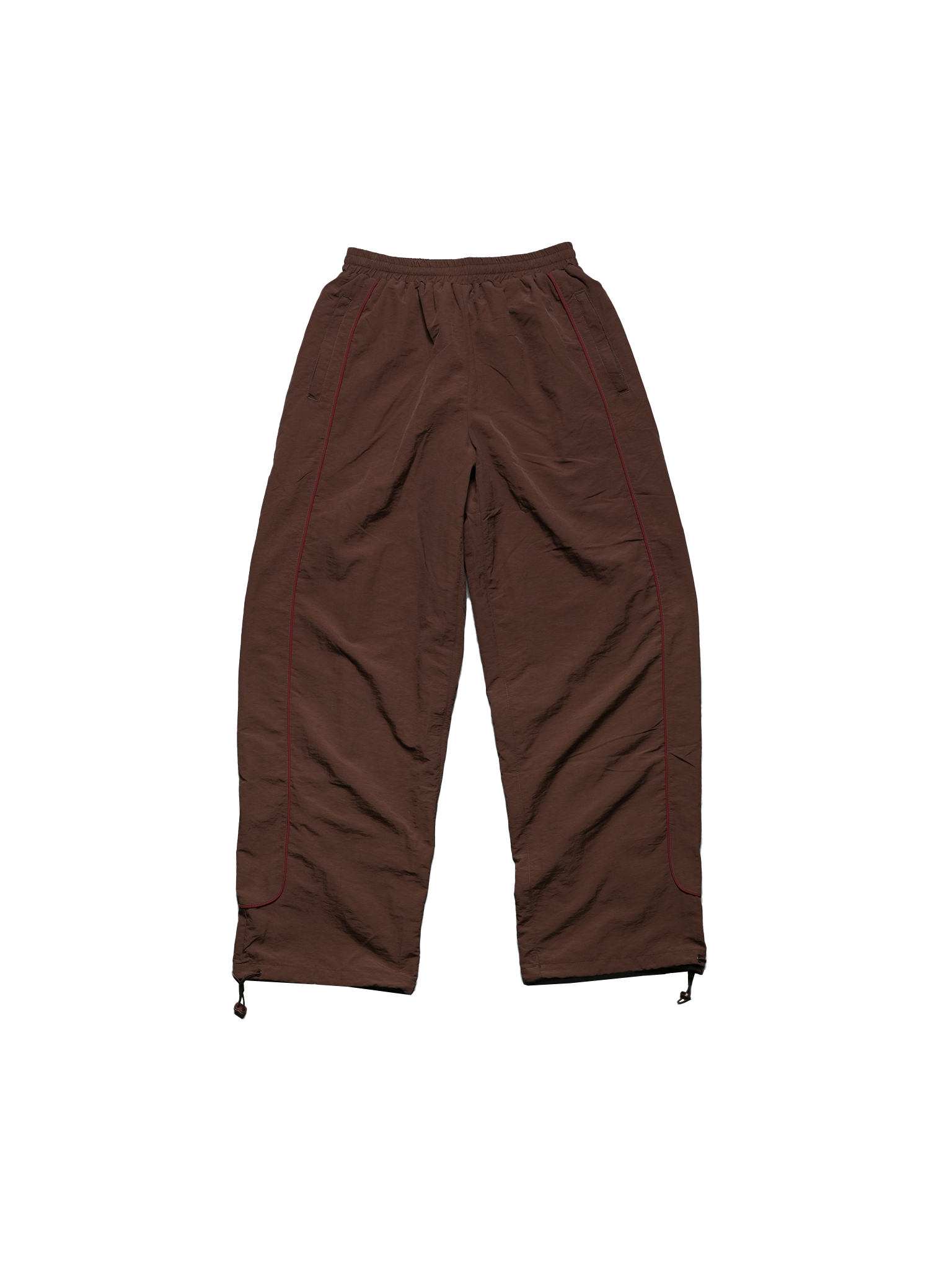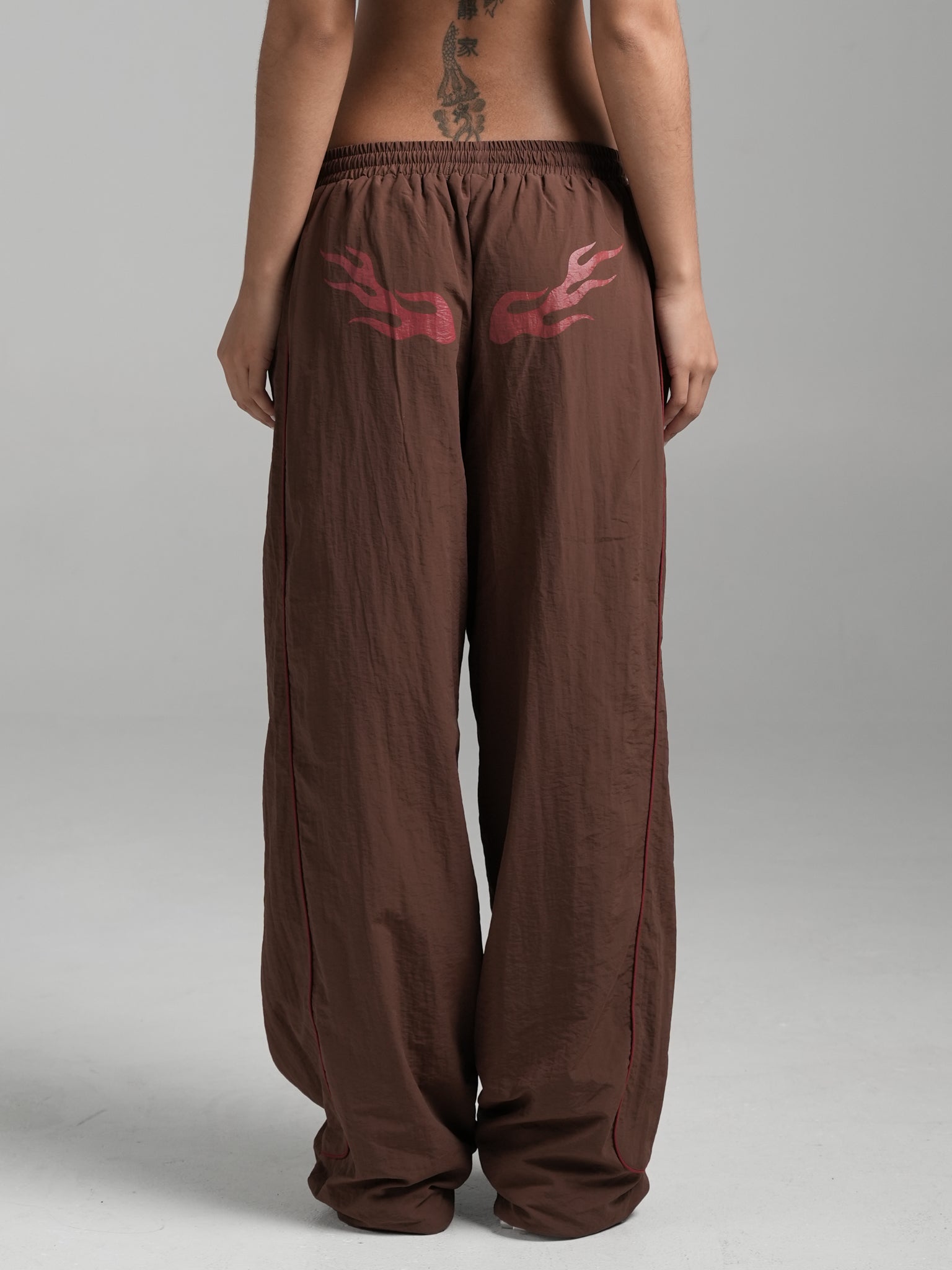 Sporty oversized track pants with flame graphics on the back. Designed in a breathable nylon fabric with reflective piping and logo.