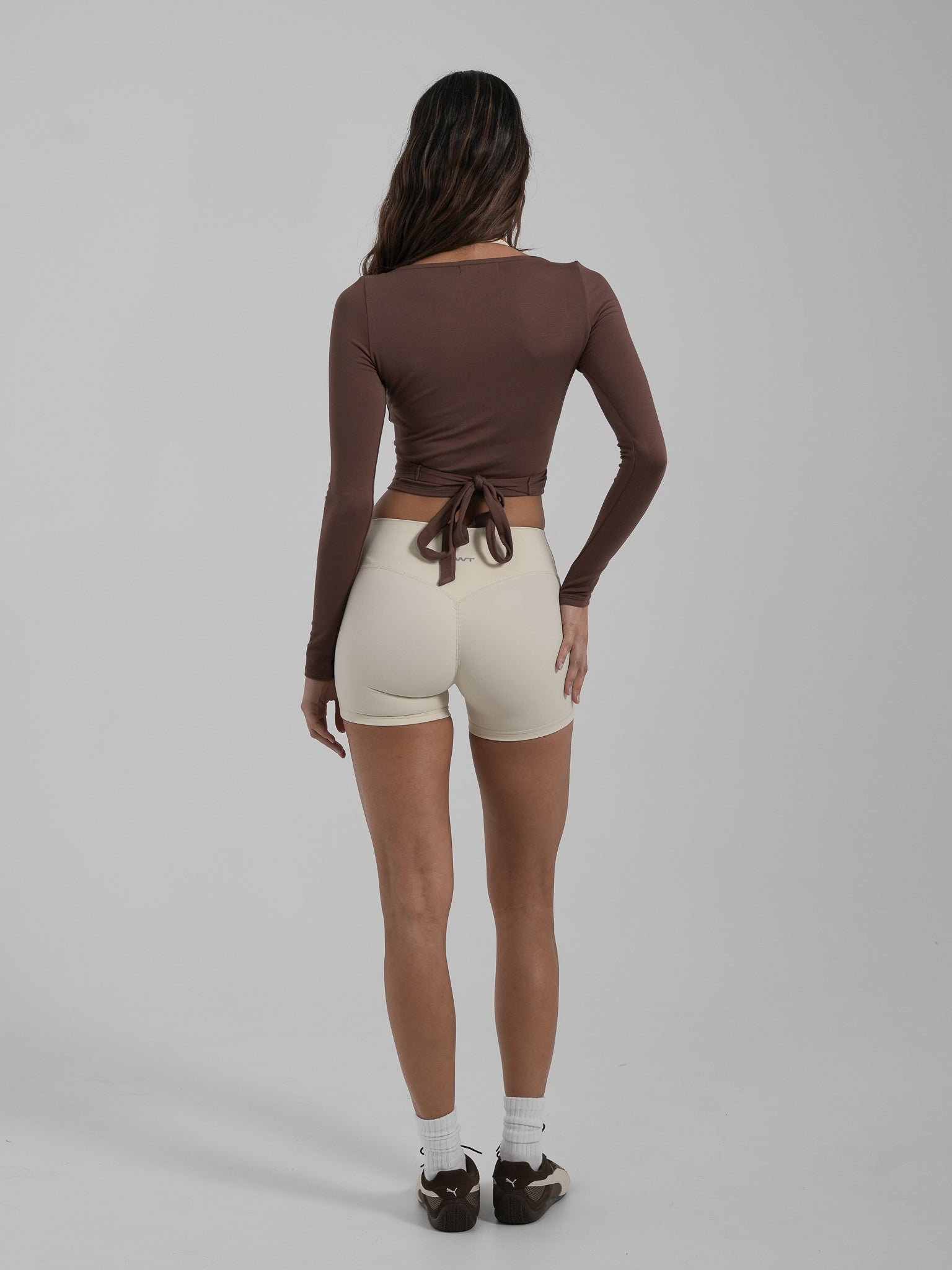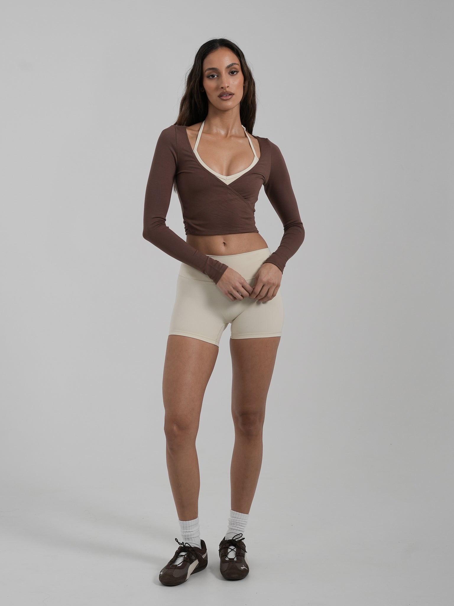 Designed with a plunging neckline, tie finish, and full-length sleeves, it layers effortlessly over active sets or pairs back with everyday staples.
